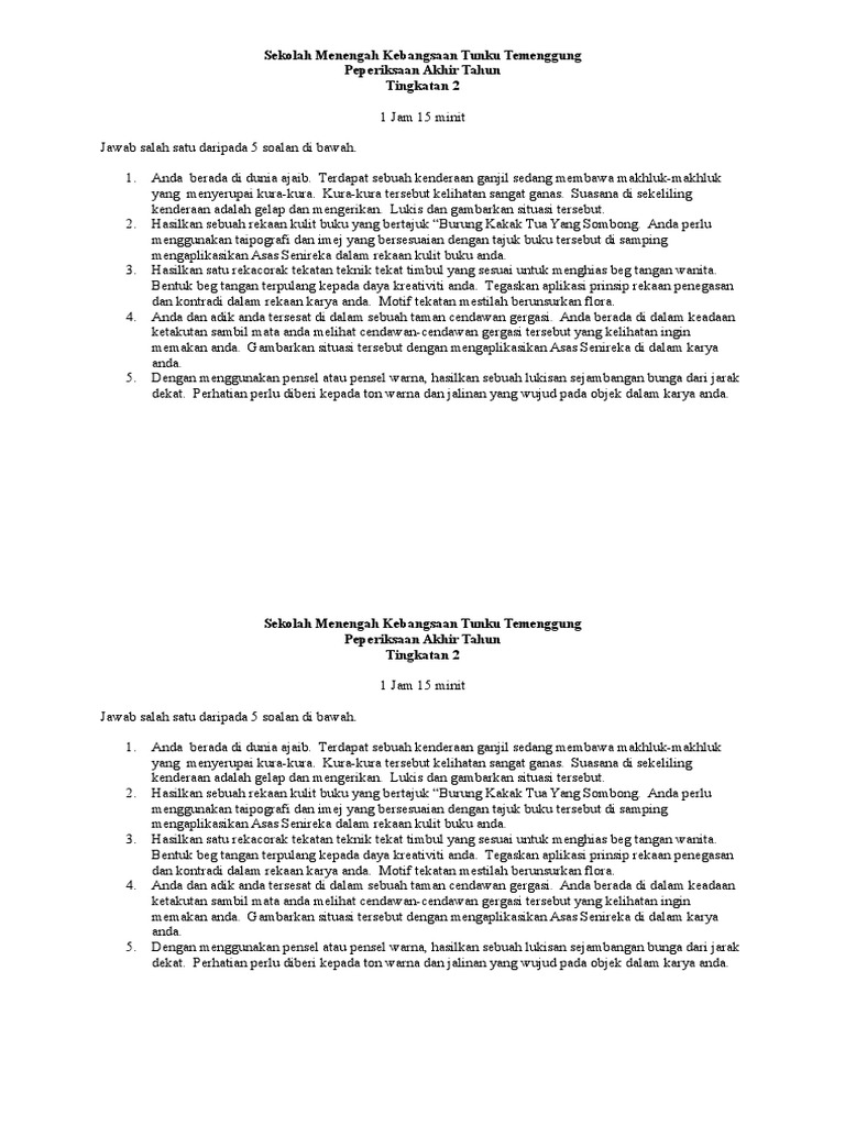 Rujukan buku teks pendidikan seni kreatif (masalah pembelajaran) tahun 2 muka surat 76 dan 77. Video pengenalan tentang garisan dalam buku teks pendidikan kesenian tahun 2. Himpunan rpt pendidikan seni visual tahun 2 yang power khas untuk ibubapa dapatkan! Pendidikan kesenian tahun 2 unit 4 pusing gasing pusing alat permainan tradisional. Sarjana pendidikan (s.pd.) jurusan pendidikan sendratasik konsentrasi pendidikan seni tari melalui visi dan misi yang dikembangkan untuk menghasilkan lulusan sarjana berkompetensi utama sebagai guru seni tari.